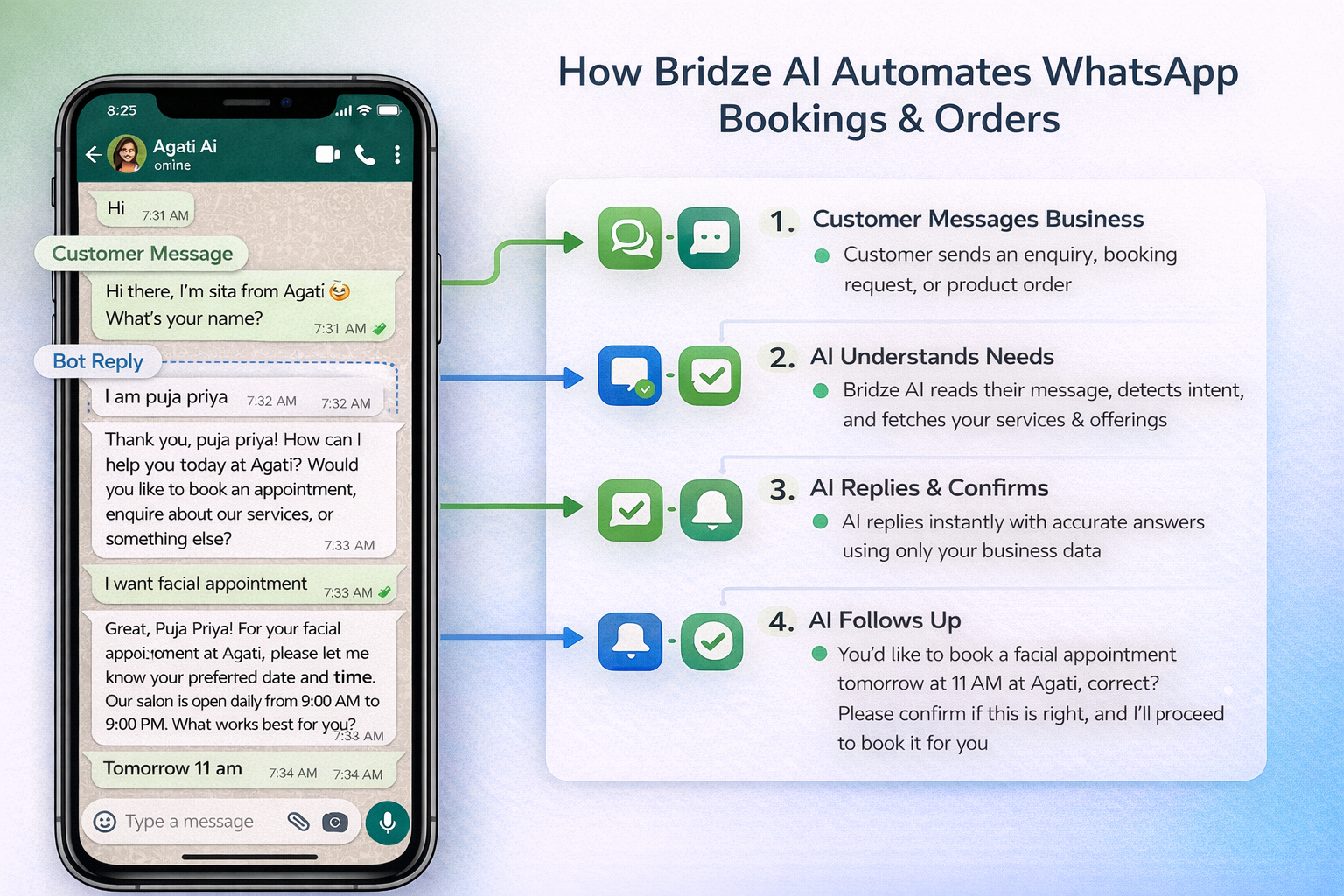 Bridze is more than a chatbot. It manages conversations, confirms appointments, tracks customers, and supports real business workflows.
